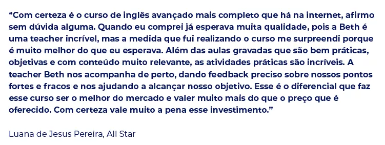 Há 1 tarefa de casa de Speaking e 1 tarefa de casa Writing em cada módulo. Você receberá feedback personalizado e correção por mim mesma para cada uma dessas tarefas.