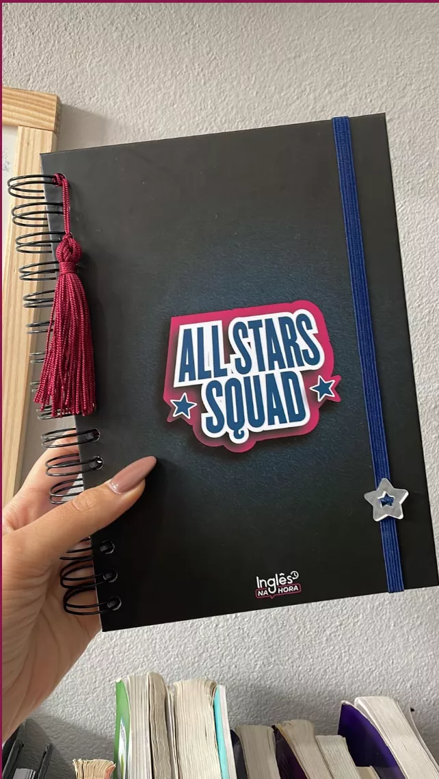 Ao terminar o Midterm Exam, os alunos recebem nosso All Stars Squad notebook!